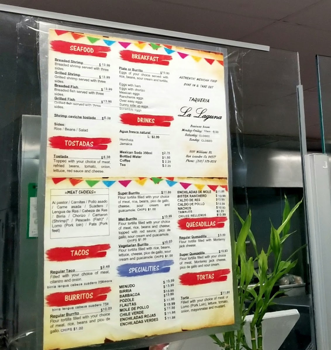 Looking for a place that truly brings the flavors of Mexico to life? Look no further than Taqueria La Laguna Menu. Nestled at 1011 Williams St, San Leandro, CA, this spot offers a delightful variety of authentic Mexican dishes that will transport your taste buds south of the border. From sizzling tacos to mouth-watering burritos, each dish is crafted with fresh ingredients and packed with flavor. Whether you're craving something light like a crispy taco or in the mood for something heartier, their menu has it all. Enjoy the cozy ambiance while savoring delicious dishes, all prepared with the care and passion that make Taqueria La Laguna a local favorite.